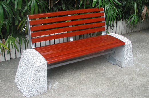 Banco con respaldo al aire libre, bandeja de asiento de madera maciza, patas de piedra de cemento, montaje en superficie, acabado de pintura en polvo.